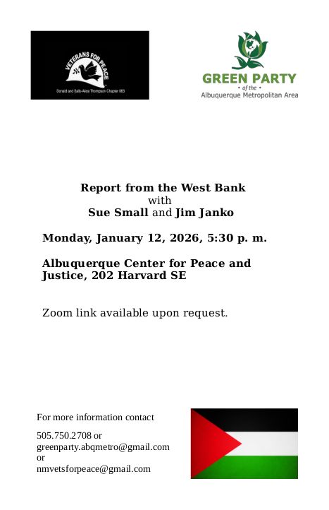 Green Council meeting, Sunday, December 7, 2025, 2:00 p. m. MST. Contact GPNM (info@greenpartyofnm.org) for into.