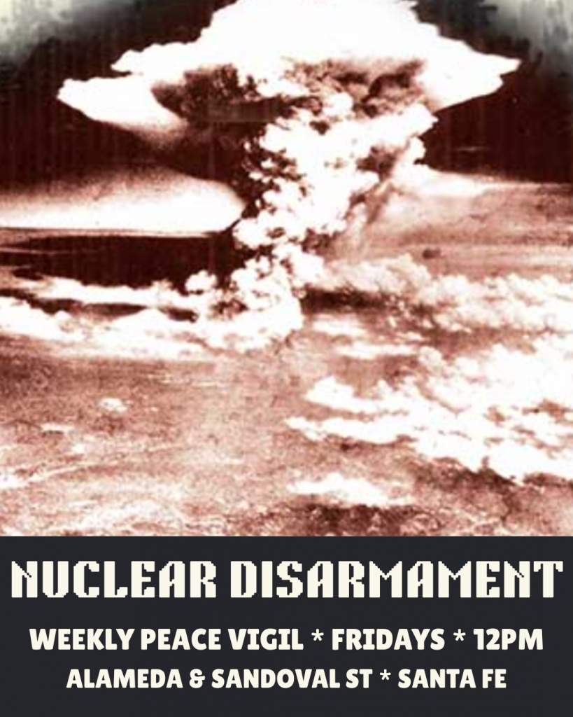 Stop bombing the world! Join the weekly Peace Vigil on Friday, March 13, from noon to one o’clock at the intersection of Alameda and Sandoval Street in Santa Fe.